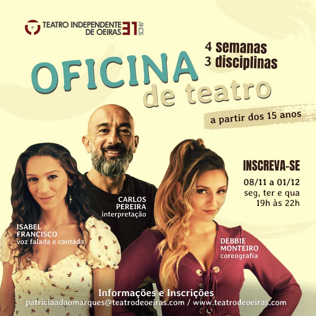 A oficina decorrerá às segundas, terças e quartas, das 19h às 22h, contando com os formadores Isabel Francisco (Voz cantada e falada), Carlos Pereira (interpretação) e Debbie Monteiro (coreografia). Saiba mais sobre as disciplinas e os respetivos formadores na página do Teatro Independente de Oeiras.